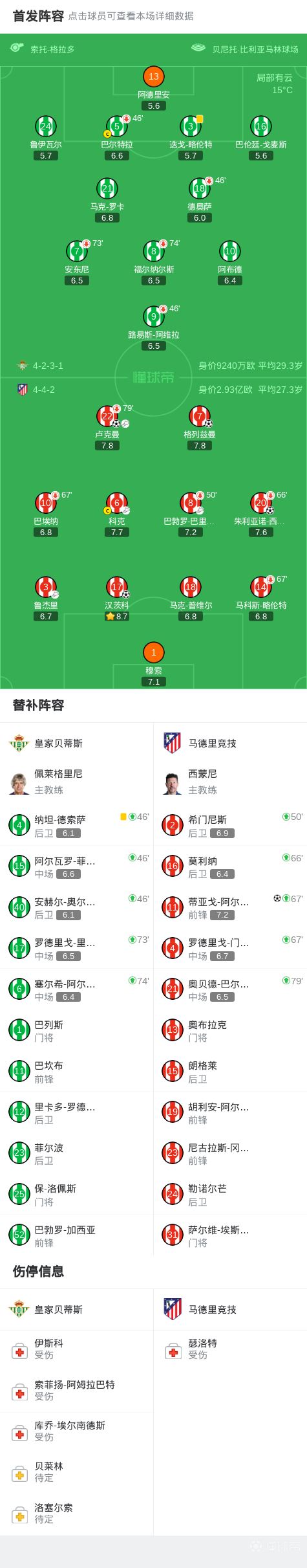 北京时间2月6日西班牙国王杯 1/4决赛,皇家贝蒂斯对阵马德里竞技。上半场,汉茨科率先破门。鲁杰里助攻,小西蒙尼建功。巴里奥斯传球,卢克曼首秀破门。下半场,卢克曼助攻,格列兹曼得分。终场前,格列兹曼射门被扑出,阿尔马达补射得手。全场比赛结束,马竞客场5-0大胜贝蒂斯,成功晋级国王杯4强。