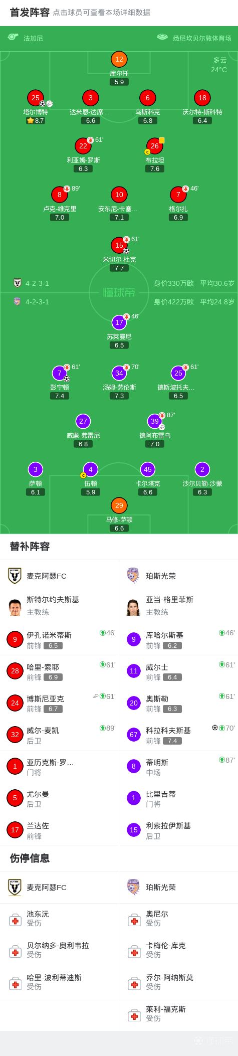 北京时间2月6日澳大利亚足球超级联赛第16轮,麦克阿瑟FC主场对阵珀斯光荣。麦克阿瑟FC米切尔-杜克破门,塔尔博特分别破门。库尔托两次失误导致丢球,珀斯光荣队彭宁顿与科拉科夫斯基破门。最终比分麦克阿瑟FC 2-2 珀斯光荣。
