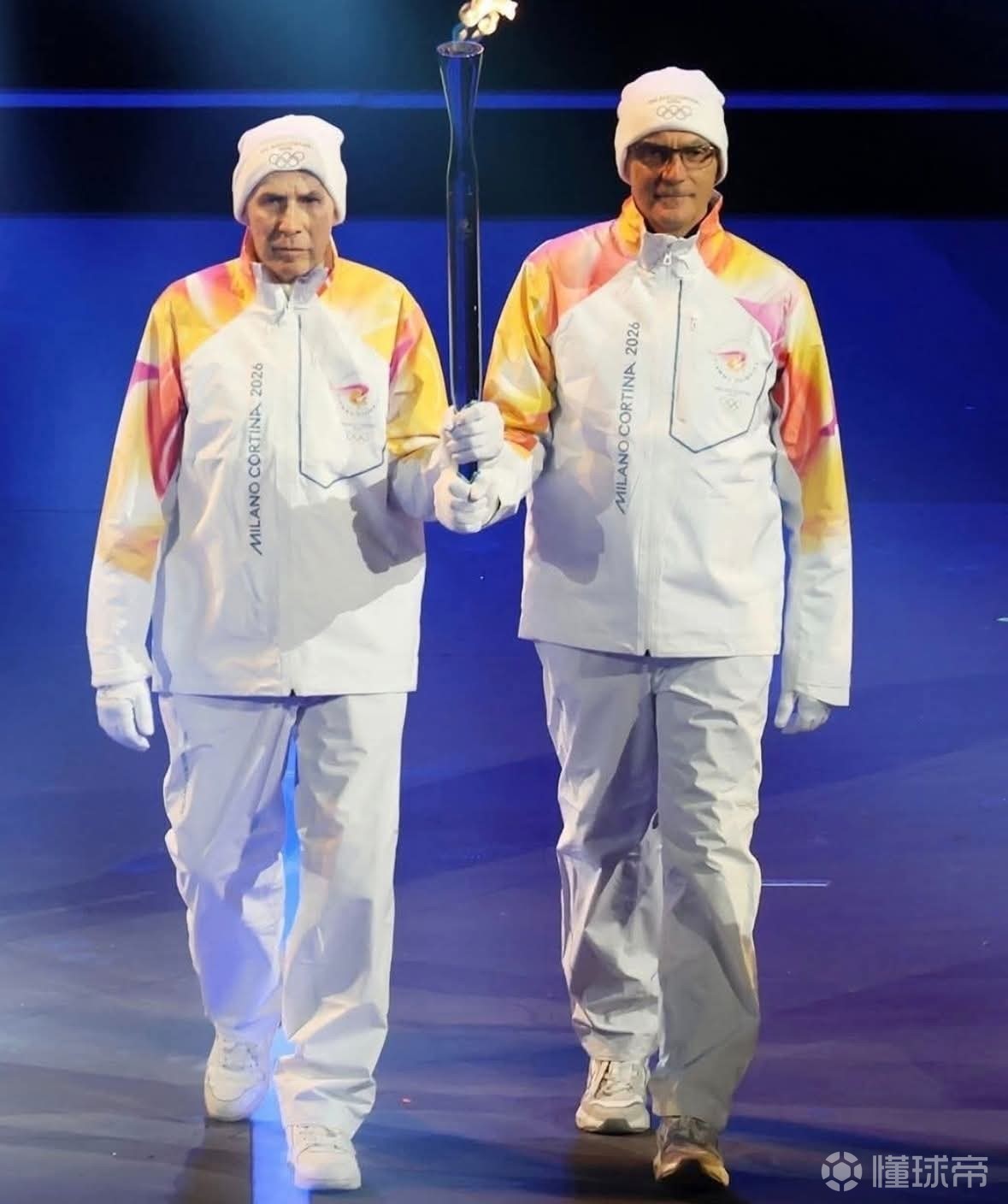 在本届米兰冬奥会的开幕式中,两人共同手举圣火,在意大利国宝级歌唱家安德烈-波切利演唱《今夜无人入睡》的歌声中,缓缓走下国旗台,将圣火引入圣西罗球场的传递跑道。