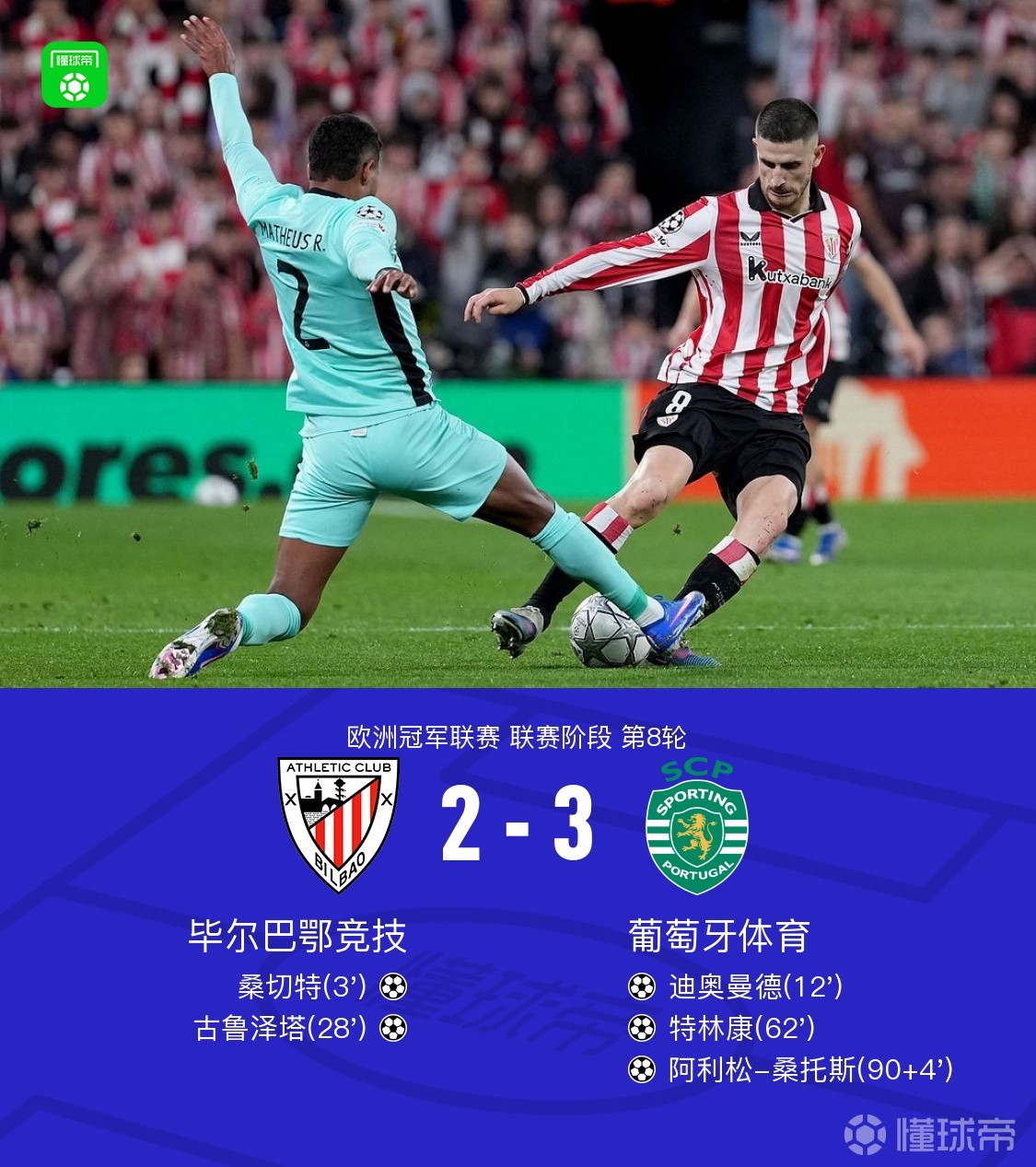 • 半场战报:毕尔巴鄂竞技2-1葡萄牙体育,古鲁泽塔,桑切特建功,迪奥曼德破门