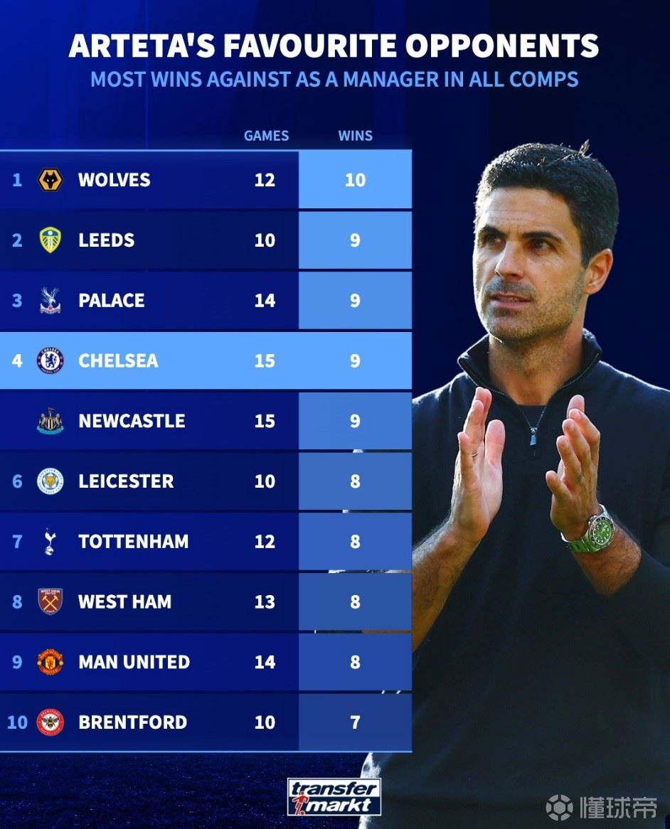 • 塔帅生涯赢球场次最多的10个对手:15战切尔西9胜排名第4