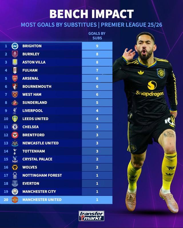 • 替补制胜,库尼亚是本赛季英超首位替补登场进球的曼联球员