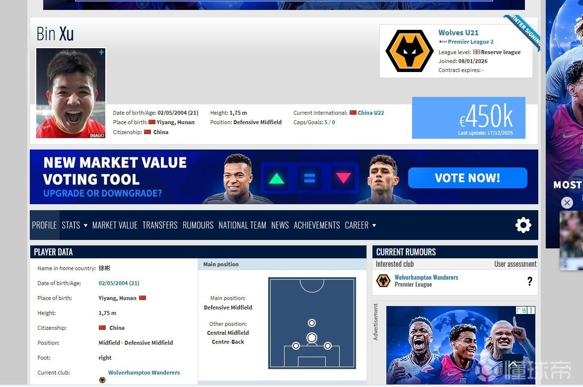 • 在欧洲开启新挑战,德转显示徐彬正式加盟狼队U21梯队