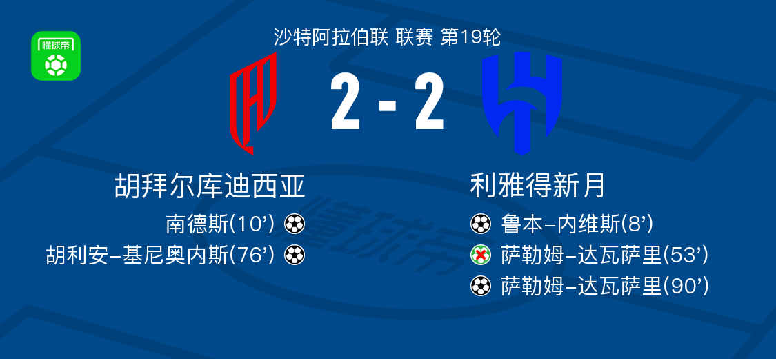 • 胡拜尔库迪西亚2-2利雅得新月,鲁本-内维斯打破僵局,萨勒姆-达瓦萨里扳平