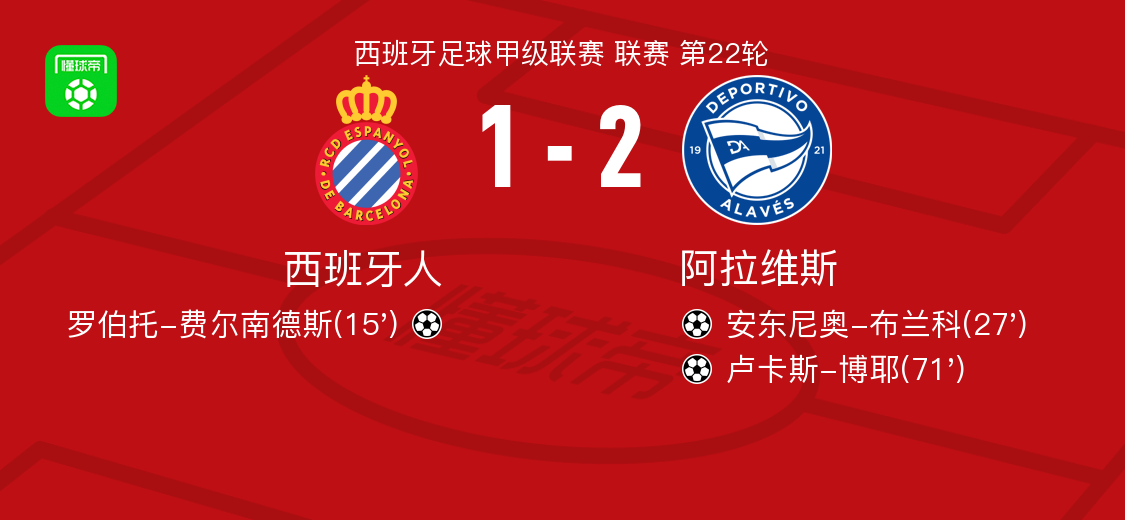 • 阿拉维斯2-1逆转西班牙人,卢卡斯-博耶建功,安东尼奥-布兰科破门